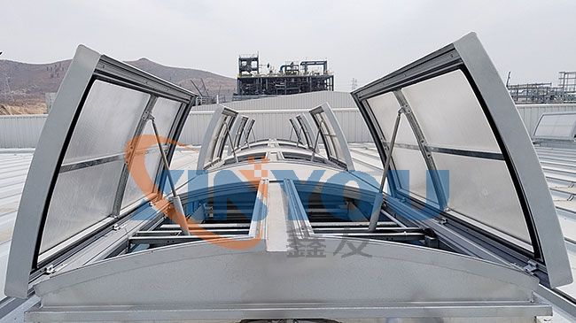 鑫友承接萬華化學集團物資有限公司煙臺綜合倉庫電動排煙天窗工程,采用圓拱型對開式采光排煙天窗,該工程全部安裝完畢,已經(jīng)達到消防工程驗收標準。