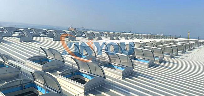 圓拱形的設(shè)計(jì),外觀優(yōu)美、通風(fēng)排煙兼顧自然采光,可實(shí)現(xiàn)消防聯(lián)動控制,開啟角度一般為30度到45度***開啟角度為90°。 夏季有利于排水,冬季不積雪。采用單開或?qū)﹂_形式。天窗啟閉按群組控制,每組天窗數(shù)根據(jù)天窗數(shù)量及控制距離決定。